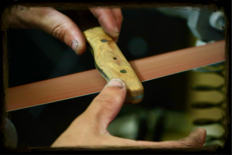 Pour les manches j'utilise le bois de ma région, il en existe une multitude comme le Noyer, le Hêtre, le Frêne, le Peuplier, le Pommier... Mais également de la matière animal comme le bois de Cerf, Chevreuil ou même des peaux tannées pour les étuis.