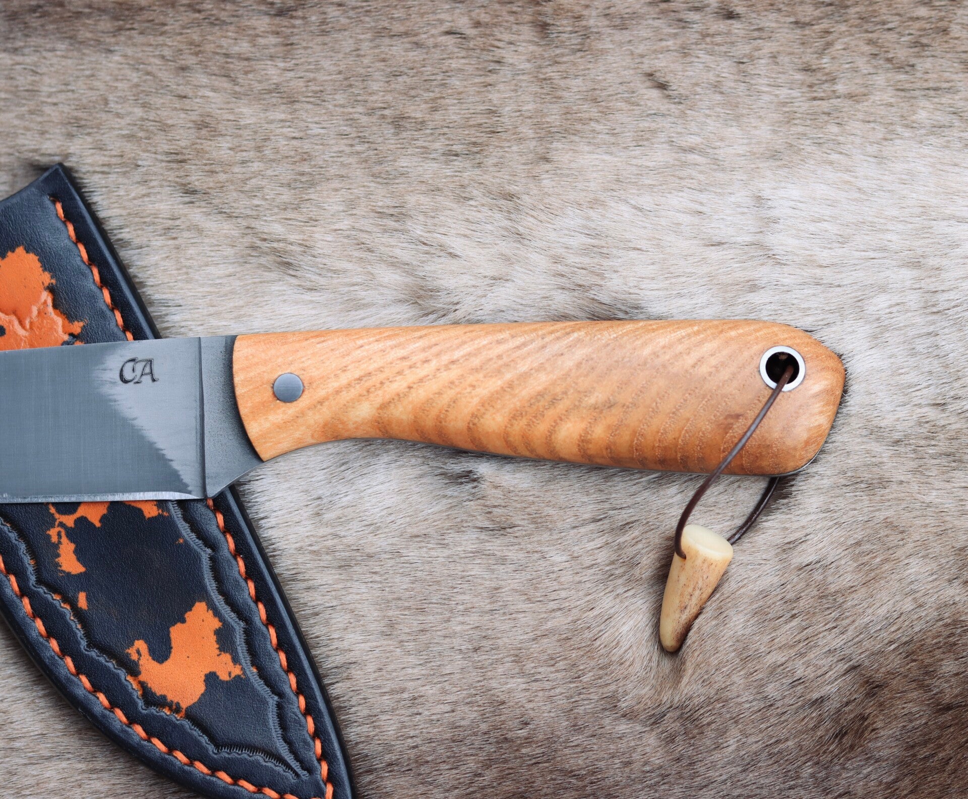 Couteau de chasse modèle “Trappeur“ avec une lame en acier carbone C75 patiné, un manche en Érable et son étui en cuir de bovin prémium, double teinture English/Black, couture double noir et passe ceinture au dos de l'étui.